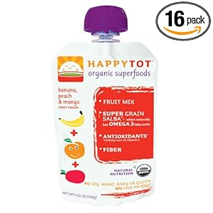 HAPPYTOT banana, mango, and peach is an easy organic super food for kids. It is a unique recipe of fruits and veggies combined with super grains--a recipe that is sure to delight your toddler. It is all organic with 100% natural ingredients, no pesticides, no chemical fertilizers, no genetic modifications, and no preservatives. Made out of organic mango, organic banana, organic peach, salba, organic lemon juice concentrate, and ascorbic acid, this product contains no gluten, wheat, soy, dairy, or added sugar. It is a good source of natural omega-3’s--822 milligram per serving and is rich in antioxidants. This is sold in baby food pouches that are BPA and phthalate free. These pouches are shelf stable, affordable, and convenient for the moms on-the-go. This is sold in a pack of sixteen 4.22-ounce pouches.